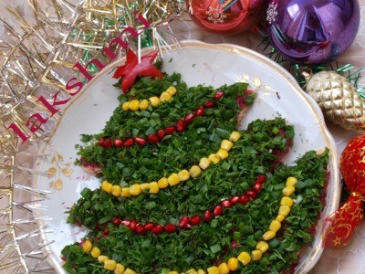 Верх салата смазать сметанным соусом и украсить. Для украшения можно использовать зёрна граната, кукурузу, зелень, зелёный горошек, нарезанные маслины.