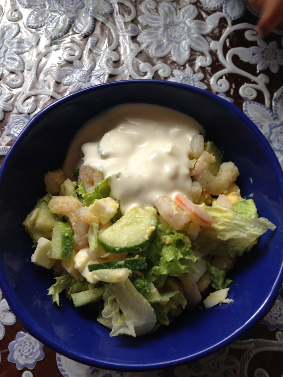 Креветки, огурец, яйца (в идеале просто белки), салатный лист, домашний соус из йогурта (йогурт+чеснок+горчица+соев. соус) И кушайте хоть целый день, ничего вам за это не будет!![]()