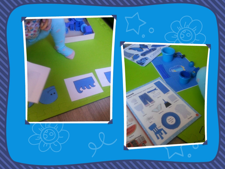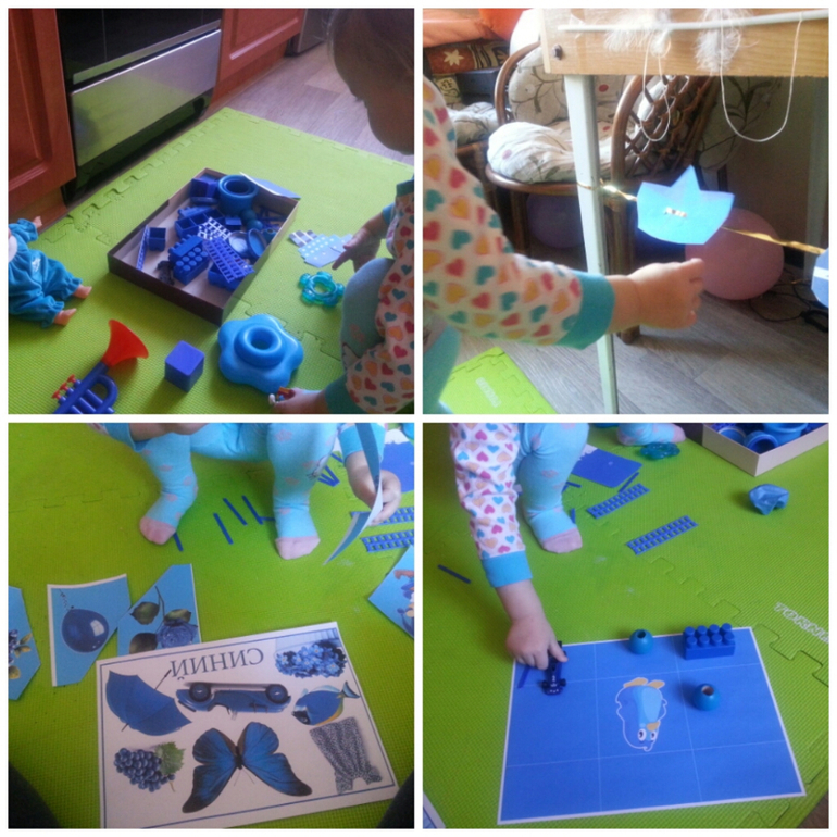 Собирали все синие вещи, катали по морю кораблики,герой дня нашлась у нас синяя кукла. Смотрели синие картинки , собрали синее лото, искали синие предметы. Нашли за