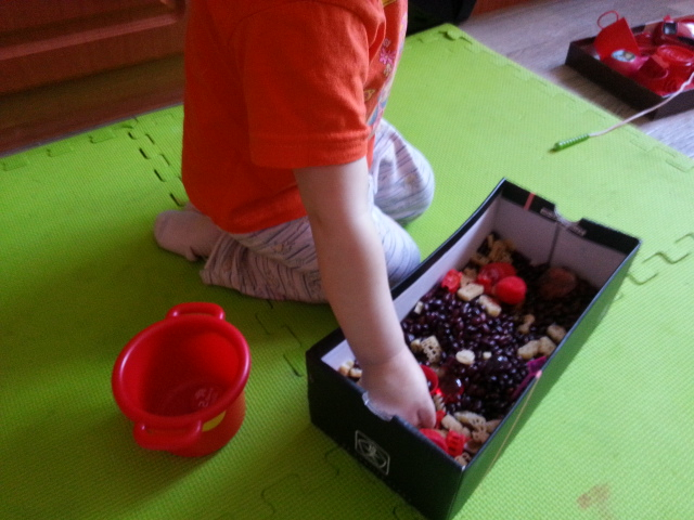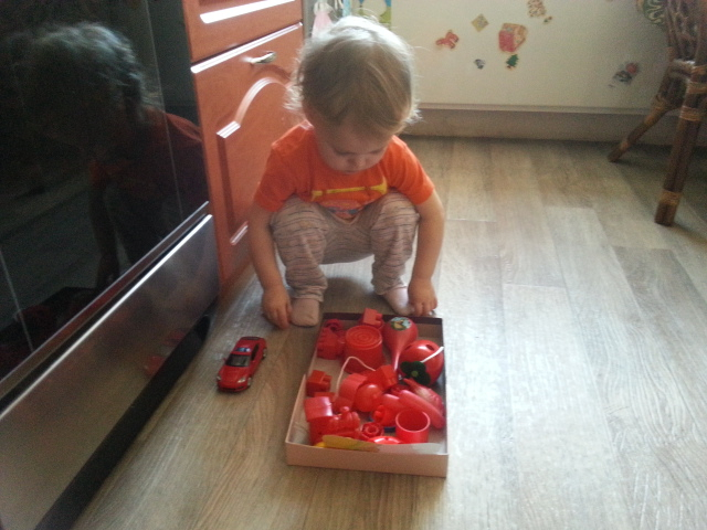 Смотрели и собирали красные игрухи по дому, в фасоли искали красные крышки, разукрасили бусы и жарптицу,собрали курице всех цыплят, шагали пальчиками, разукрасили божию коровку, собрали все грибы и отсортировали красные.