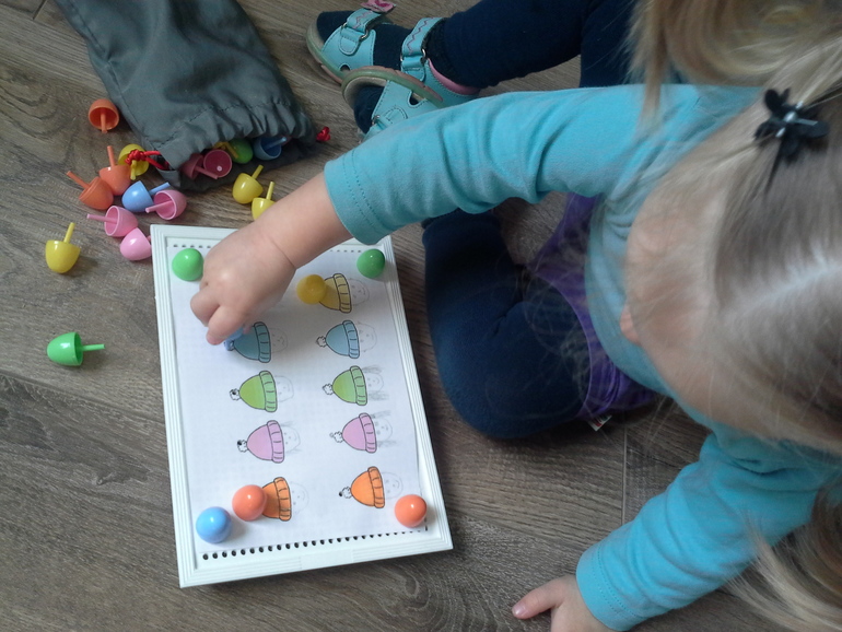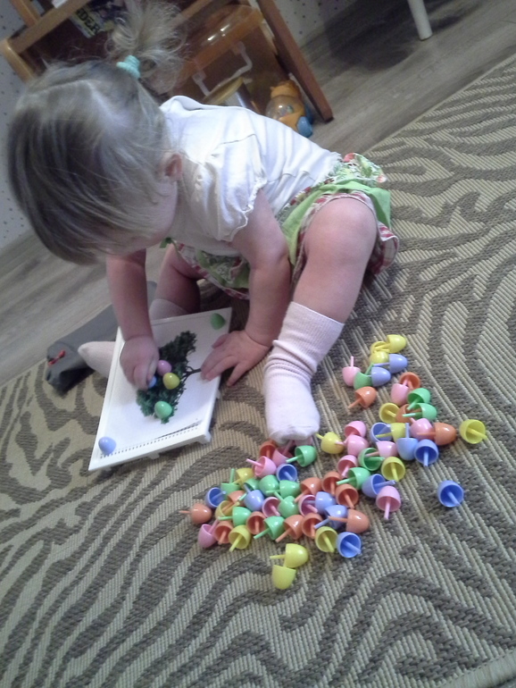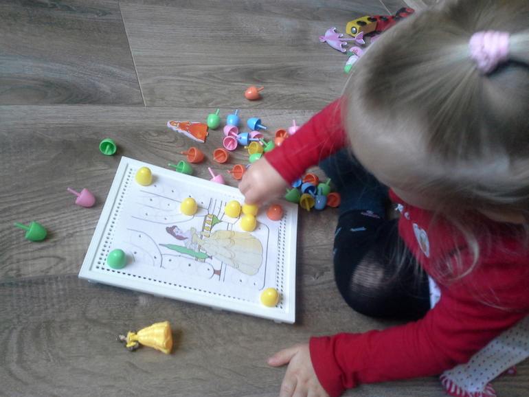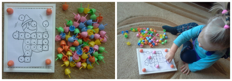 Когда я её покупала в 1,5 Ульянкиных года, меня ничуть не смущала пометка «3+». «Да-да», - думала я, - «везде-то эта пометка, но это же такая интересная игрушка и такая полезная для развития моторики - беру!». Первый день играли долго. Вставляли «ягодки» в хаотичном порядке - вынимали - и по новой. Разумеется, собрать рисунок по образцу Ульяне было (и сейчас, конечно, тоже) не под силу, да и мне не позволялось. Во второй день интерес к игре составил 5 минут, в третий- 1 минуту, а потом стало неинтересно, и коробка с мозайкой стала пылиться себе тихонько в уголочке. «Нет», - подумала я. Из чего-угодно можно сделать игру! Села, напридумывала игровых заданий - нагуглила к ним картинок - напечатала, и мы стали играть! Играем с удовольствием! И с тех пор мозаика больше не пылится в уголочке!