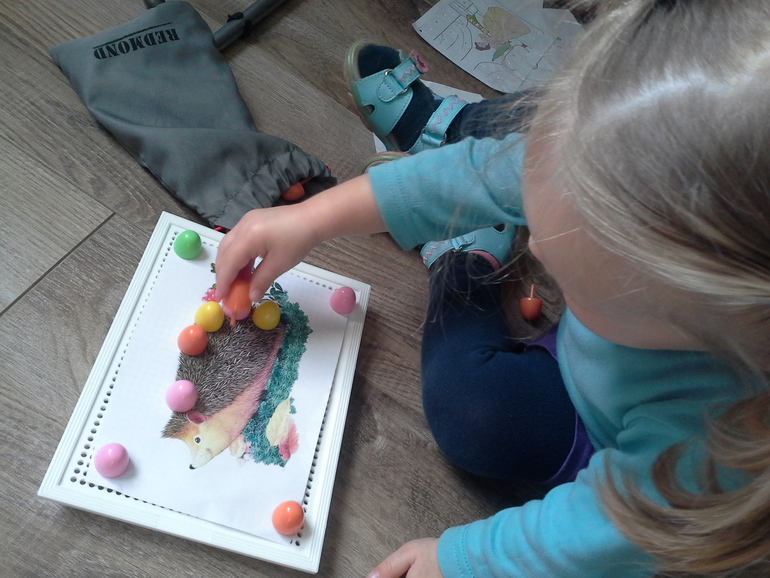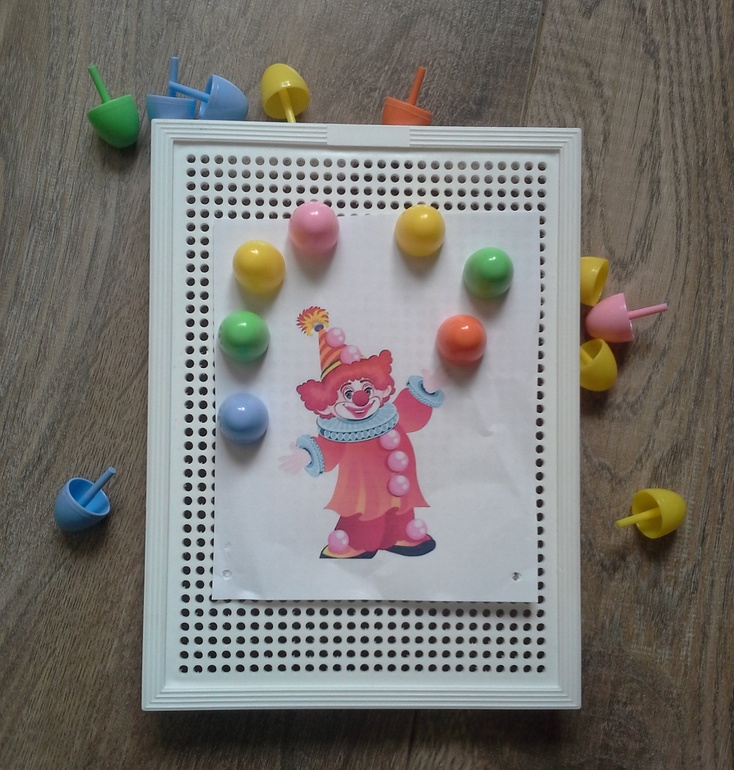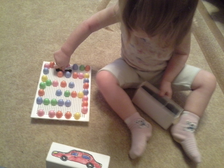 Задания этого же типа. Здесь ребенок просто берет первую попавшуюся «кнопку» и вставляет в заготовленную заранее дырочку.
