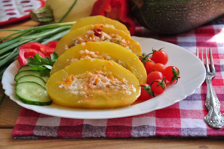 Начиняем кабачки фаршем, хорошо, чтобы не оставалось пустых мест.