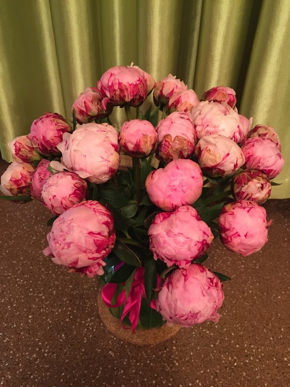 И тут приехал с работы муж в 20:00 со свертком газеты в руках:) И поздравил меня с третьей годовщиной законного проживания с ним:) Так и сказал:) я подумала, что это розы. Судя по длине. Разворачиваю, а там... ПИОНЫ!!! Пионы в январе! Мои любимые! Их еще и поискать, тк в цветочных магазинах они продаются крайне редко! Порадовал:) Очень:) Люблю:)