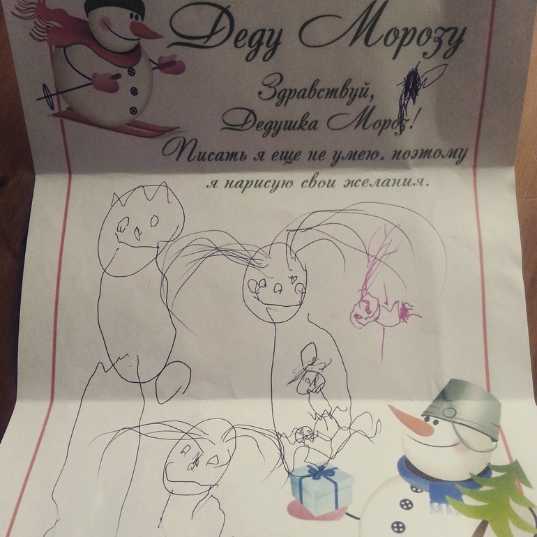 Дед мороз! Мира не дала мне ничего дописать к этому письму, и оно отправилось в первозданном виде в твой Кузьминский лес. Но! надеюсь ты меня слышишь. Учти! Она загадала не мне 3го ребенка, а беременную Барби. С мужем и совместно нажитой дочкой. Розовый ошметочек справа символизирует то, что малыш должен доставаться из живота. Прошу, не напутай слишком много совпадений. Я волнуюсь.....