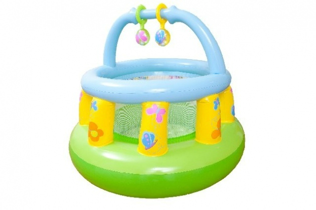 Манеж ширина основания 140 см, высота с дугой 130 см. На дуге есть две погремушки, тоже надувные, кроме того в комплекте надувной молоток, внутри молотка шарик. Борта манежа прозрачные-сетка, так что воздух циркулирует, не жарко и не душно. Дно тоже надувное, около 2-х сантиметров. Если ребенок упадет-больно не будет. Насос в комплект не входит. ЦЕНА 1150 руб.