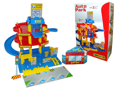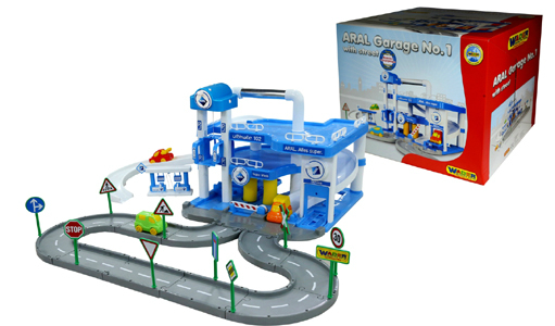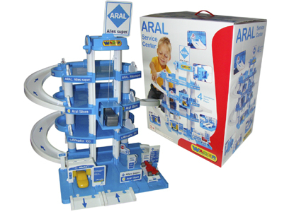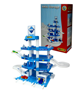 40428 Wader Паркинг ARAL 3-уровневый с дорогой. Паркинг имеет 3 этажа. Для подъема машинок на этажи можно использовать лифт. Для спуска с этажей существует серпантин. На первом этаже расположен подъемник для осмотра машин, автомойка и заправка. В комплекте к паркингу 3 машинки из пластика.Размер: 100х90х38 см. Цена 3100 руб.
