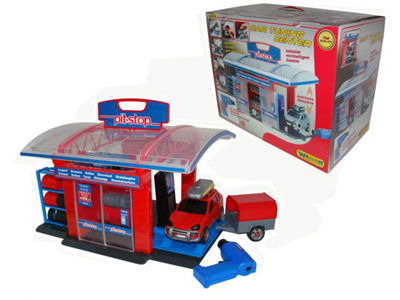 41951 Тюнинг-центр PIT-STOP. В набор входит: современный бокс, полки для колес, автомобиль, багажник, прицеп, запасные диски и шины, бампер, глушитель, «настоящий» электрический шуруповерт который вращается в обе стороны и очень реалистично жужжит, подъемная эстакада, которая сама поднимается и опускается. Для работы эстакады и шуруповерта требуется по 2 батарейки АА. Размер: 49х30х40 см. Цена 3000 руб.