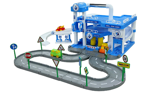 51530 Wader Паркинг ARAL 3-уровневый с дорогой и подъемником. Для подъема машинок на этажи можно использовать лифт. Для спуска с этажей существует серпантин. На первом этаже расположен подъемник для осмотра машин, автомойка и заправка. В комплекте к паркингу 3 машинки из пластика. Размер: 100х90х38 см. Цена 3100 руб.