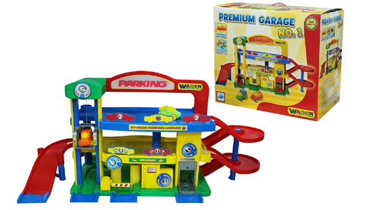 40398 Wader Паркинг Гараж №1 "Премиум" с автомобилями. Гараж является 3-х уровневым. Для подъема или спуска на этаж можно использовать лифт или серпантинную дорогу. В нижней части Паркинга установлены: автомойка, автосервис, смотровая яма, бензоколонка. В верхнюю часть с надписью "Parking" установлена подсветка, которая питается от 2-х батареек "АА". В комплект гаража входит: серпантинные лестницы, здание паркинга, знаки, заправка, автомастерская, лифт, 2 машинки, дорожные коммуникации и многое другое. Размер: 59х33х52 см. Цена 2800 руб.