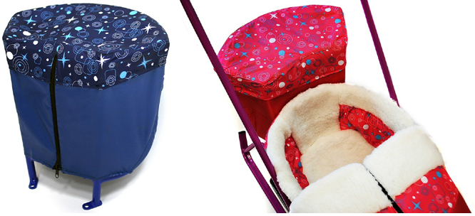 Комплект "Принцесса" (матрасик+варежки+складной тент). Размеры: Размер сиденья 68х33, высота спинки 25 см, размер накидки на ножки 40х36х13 см. Цена 2700 руб.