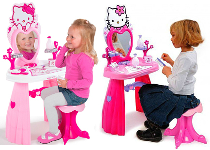 24644 Студия красоты Hello Kitty со стульчиком. Туалетный столик многофункциональный: его верхнюю часть с полочкой и зеркалом можно снять с основания и переставить на любую другую поверхность. Зеркало меняет угол наклона. А под зеркалом очень удобный маленький выдвижной ящичек для девичьих секретиков. На столике по краям 2 оригинальные полочки в виде цветов. К столику в наборе прилагается удобный стульчик. В комплекте с аксессуарами для девочки: расческа-гребешок, ободки для волос, колечки, браслет, а также два флакончика. Цена 4100 руб.