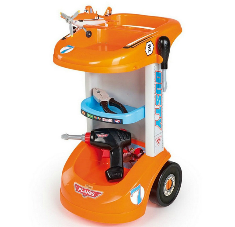 500252 Тележка с инструментами Самолеты. В тележке предусмотрено три отсека и инструменты: сборно-разборный самолет Дасти, отвертка, плоскогубцы, дрель (механическая). ЦЕНА 2750 руб.