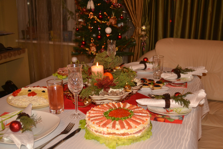 Приготовили торт "Белая овечка", салат "Сугроб", имбирные расписные пряники, морской салат "Изобилие", круассаны с креветками и хамоном, елочки из свеклы с авокадо, фруктовое ассорти.