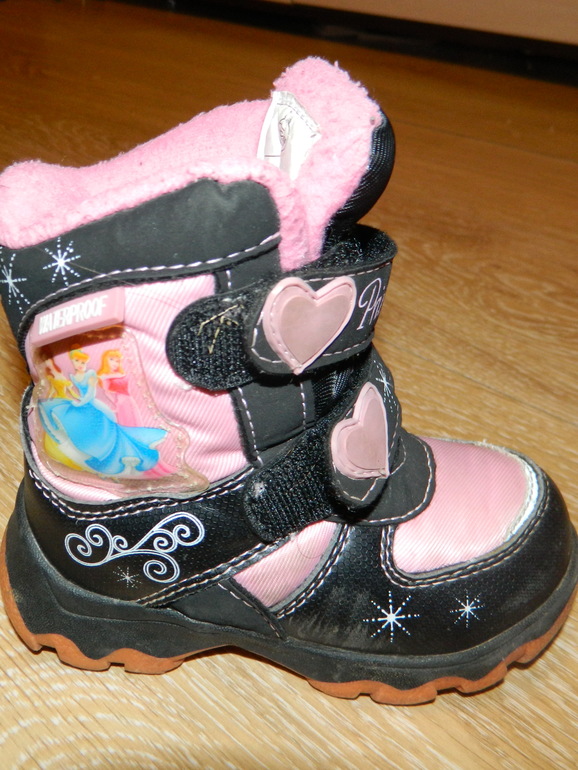 1. Зимние сапожки с красочным изображением диснеевских принцесс. Материал: верх - комбинированный, подошва - ТЭП, подклад - шерсть, waterproof (водонепроницаемый материал). Размер 22. Длина по стельке -14, 5 см.