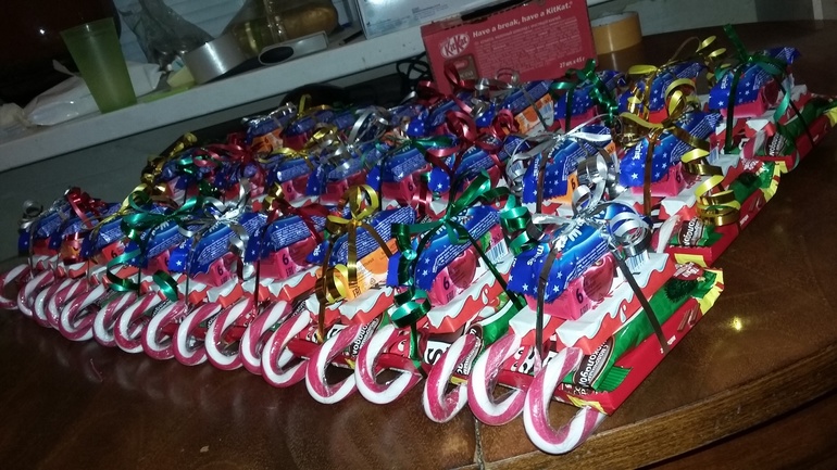 не знаю чем вы занимаетесь по ночам, а я вот развлекаюсь, как могу) сегодня навояла 27 саней Дедушки Мороза для своих первоклашек))) днем не могу, дела и Даня может запалить, а ночью-запросто, села, и сделала. начинка: 2 леденца, kit-kat, M&Ms, киндер шоколад, mamba, milky way, все между собой на двустороннем скотче и сверху цветочная лента завязана. надеюсь деткам понравится)
