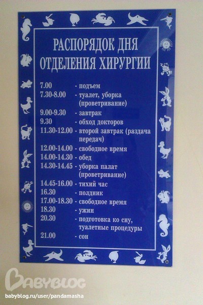 Для меня ещё минусом было то, что жизнь начинается в больнице в 7 утра. Приходят мерить температуру ребенку, а мы ещё спим обычно) Замеры у них стабильно 2 раза в день (+вечером ещё). Посещения разрешены с 8 утра до 8 вечера, так что к тем с кем нельзя лежать (по-моему до 7 лет только совместное пребывание) приходили родственники (бабушки, дедушки, мамы, папы) и тусили с утра до вечера.