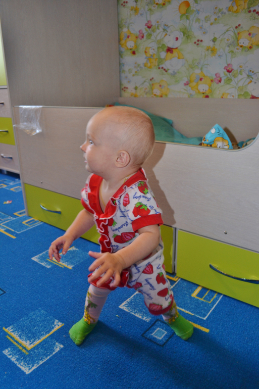 Так как хоть и может ходить, но побаивается без подстраховки. 7-14 шагов делает, а потом аккуратно садится))) Ссыт))