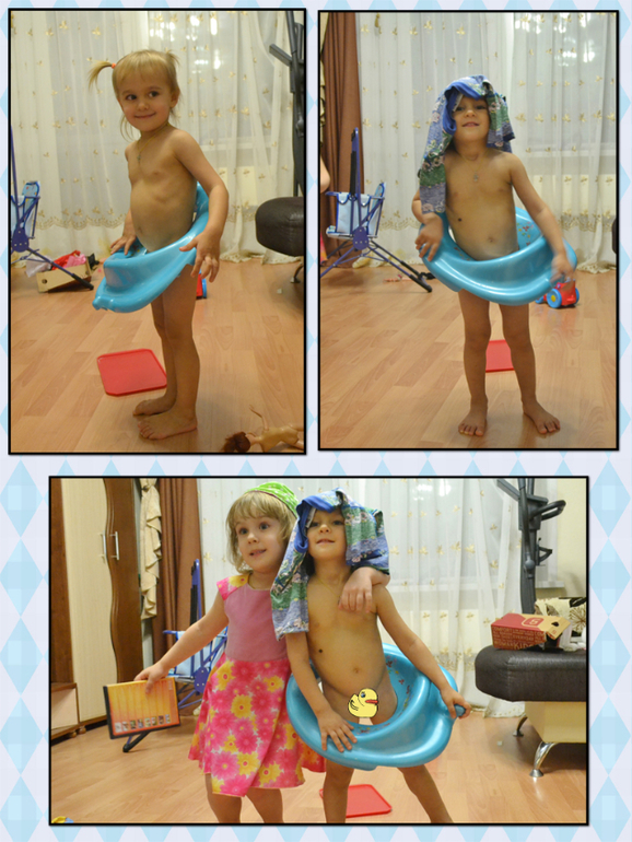 Захожу в зал - Алиса разделась до гола и нацепила круг "плавательный" типа (на унитаз подставка) и говорит, что она плавает в бассейне. Потом ещё себе "шапочку" решила нацепить. Она же помнит, что в бассейне надо шапочку надеть)
