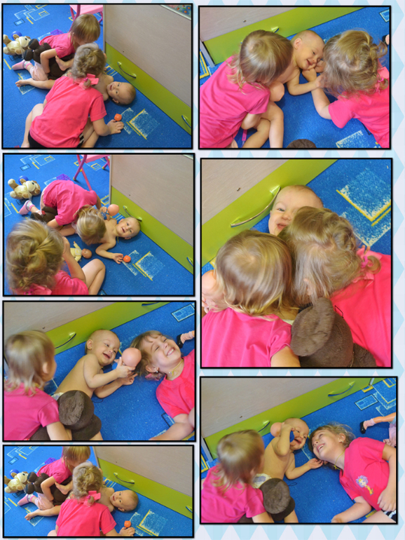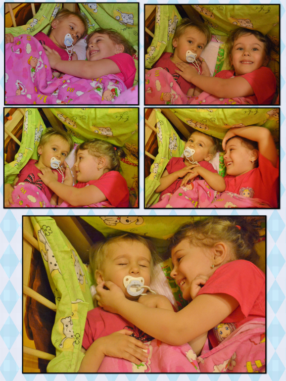 Диана с Алисой, пока я не видела, забрались в кроватку Лестюши и стали играть в лялю и маму..
