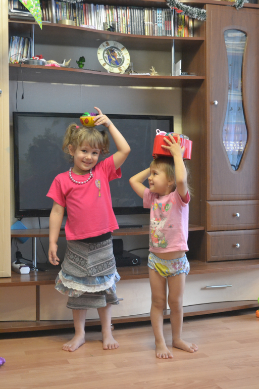 На фото очередной спектакль: Маугли. Диана надела 3 юбки, дабы сделать длину как у девочки из мультика. Как в мультике они с Алисой-Маугли несут на голове тару.