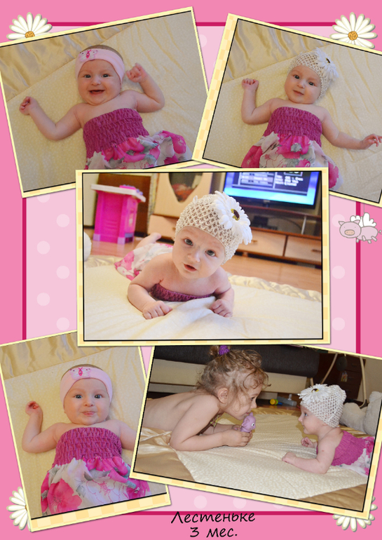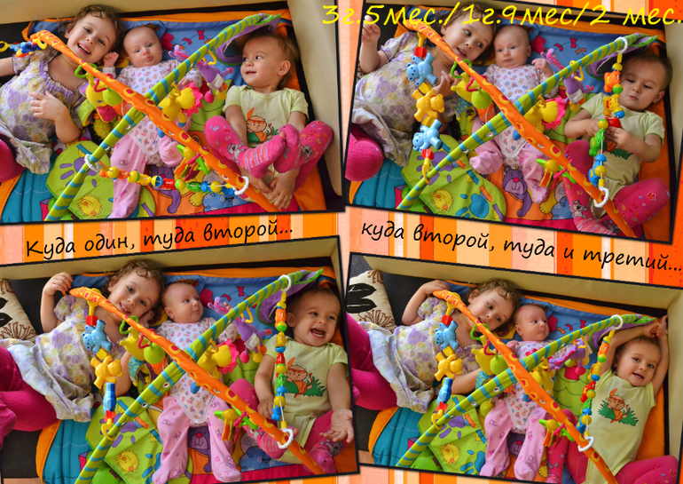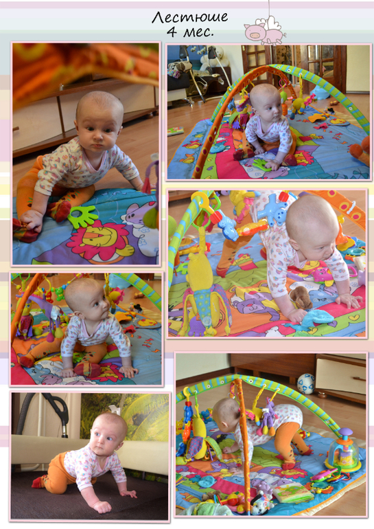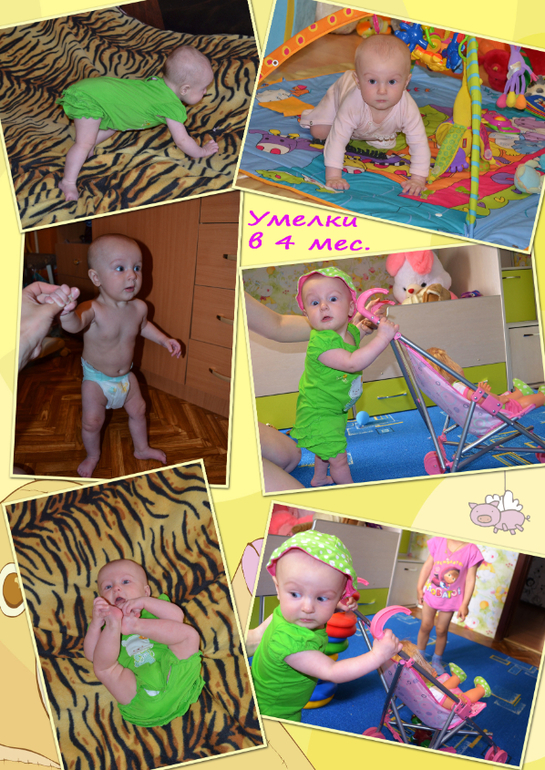 В 3 месяца наша торопыжка стала вставать на четвереньки, а в 4 месяца стала постоянно удивлять умелками. В отличие от старших, всё стала делать раньше их. В 4 месяца стала стоять на ногах и руках дугой, стояла за одну ручку на ногах, а потом и села сама, чем меня напугала, но меня все успокоили, что раз сама, значит, можно.