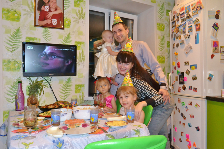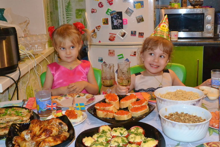 Когда нас звали в гости на застолье с тремя детьми, то это выглядело так: я с детьми в комнате с мультиками, а они все жрут, празднуют, болтают, о нас не думают в зале. Ну ладно, ищем плюсы: мне ж всё равно худеть надо!:)