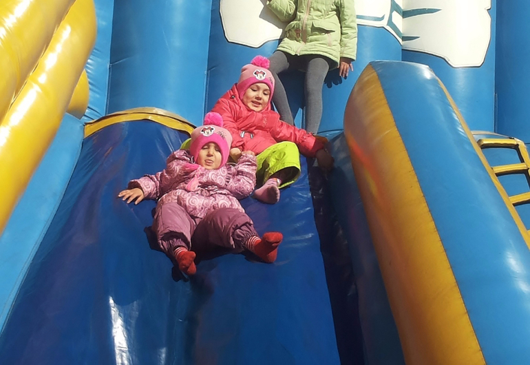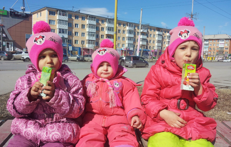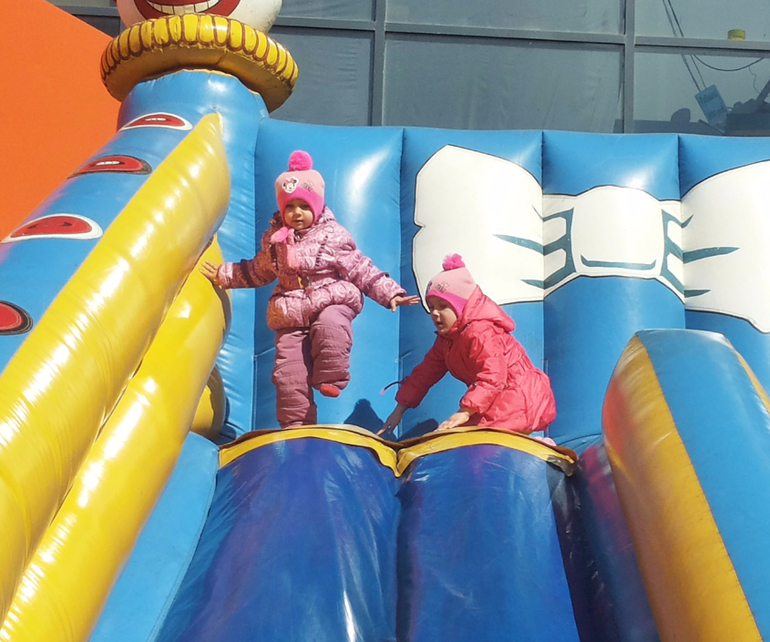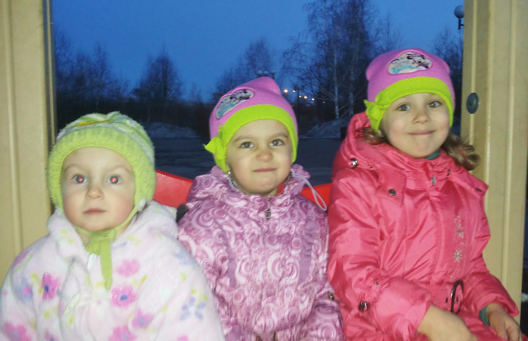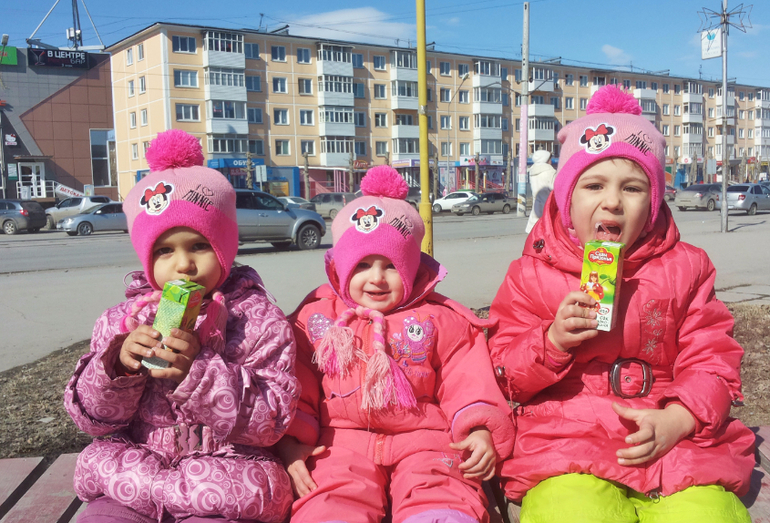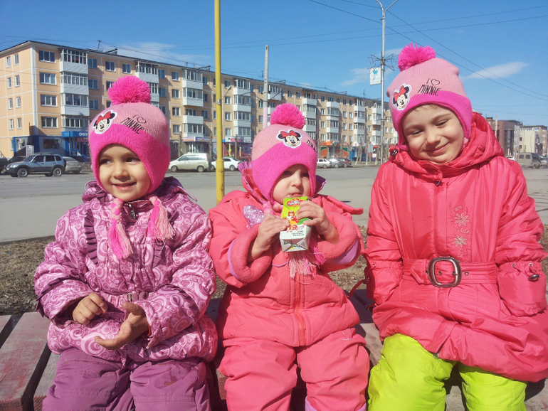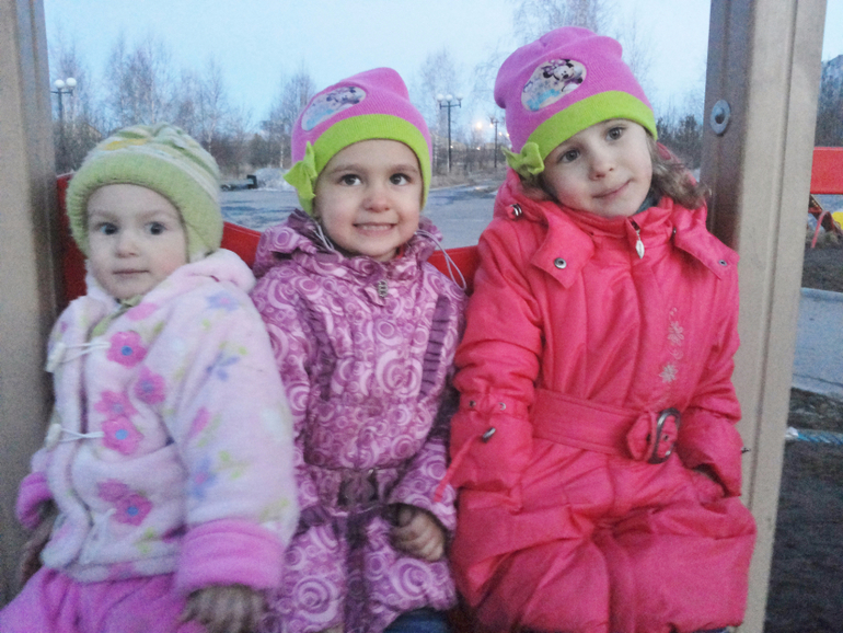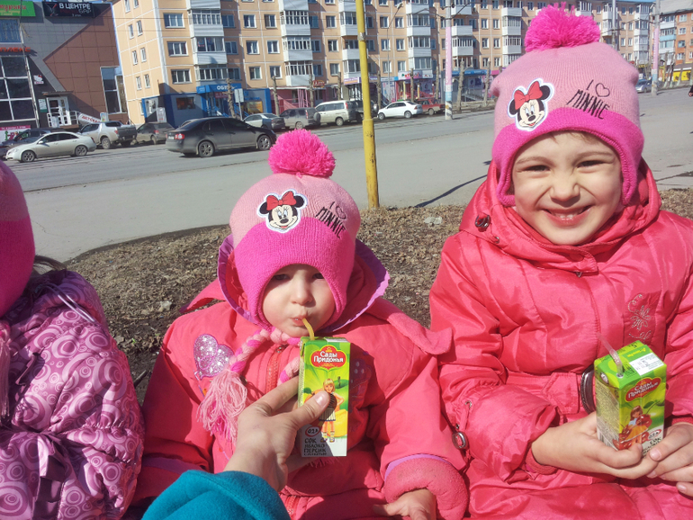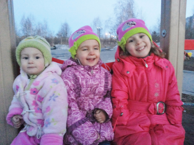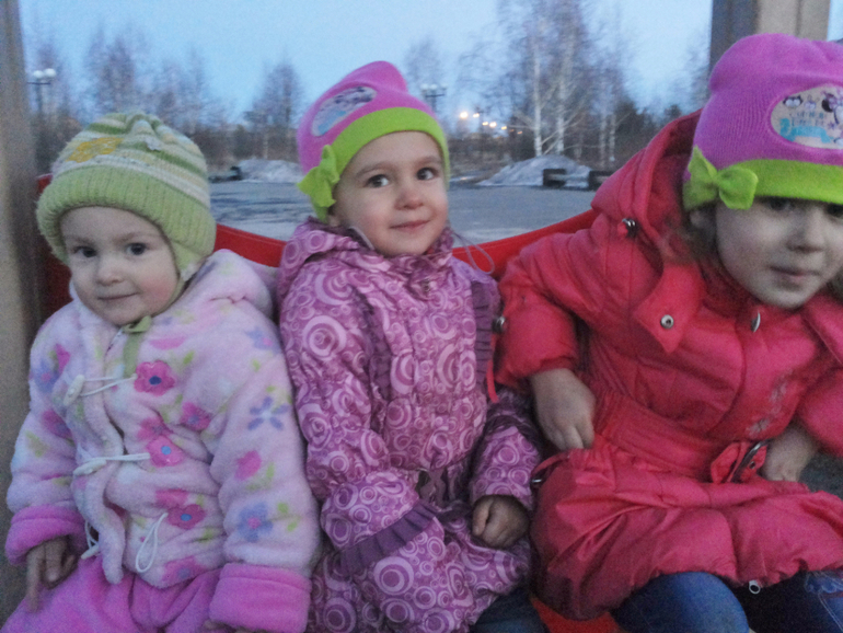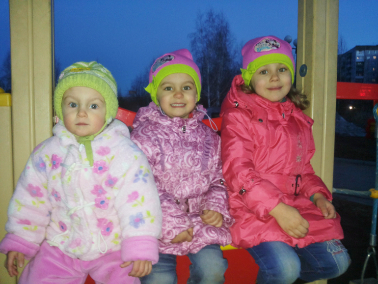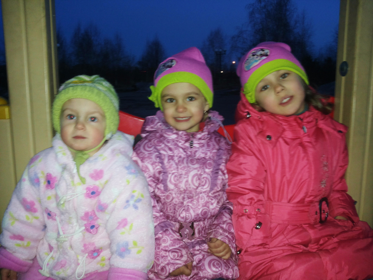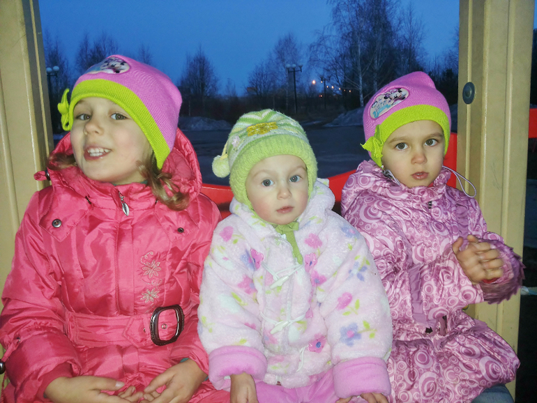 Без коляски. Зимой в санках ездили. Потом стали только пешком. Я же стала на машине ездить. Куда подальше — на машине всех довезу и там гуляем. Даже не знаю теперь, сидит ли Алеста в коляске... Надо попробовать с коляской выйти. А то мы двойную в Сочи брать собираемся.