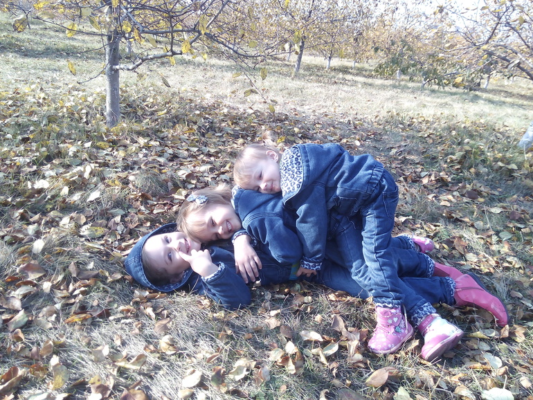 Сестрёнок лююбит))) Постоянно подходит обнимает, целует со словами "мммммуаааки!", потом берет их за руку и ведёт куда-нибудь. Любят делать втроём бутерброд: