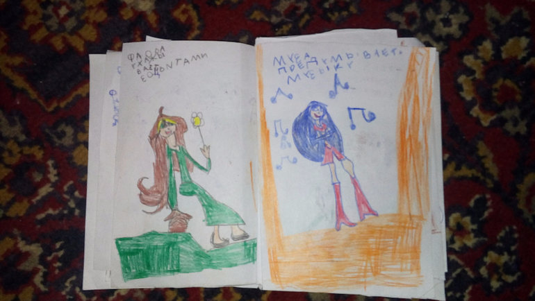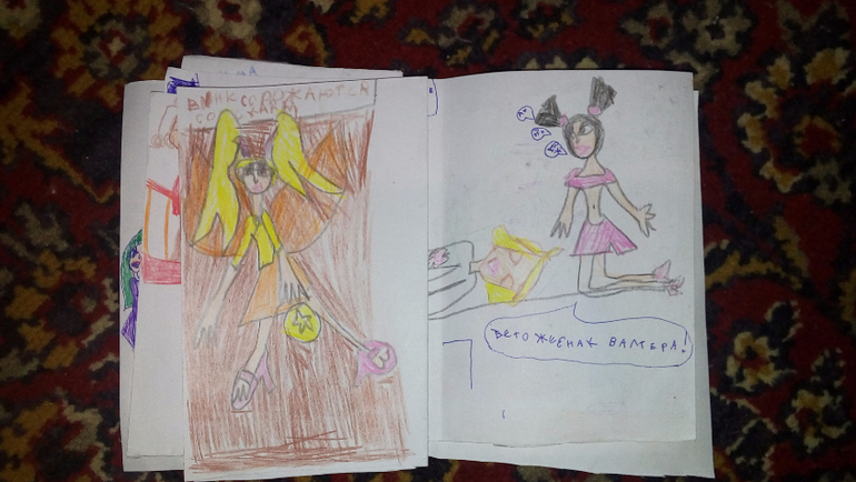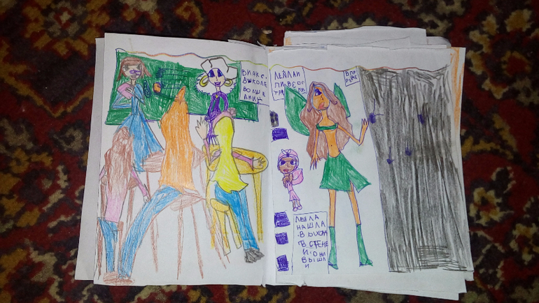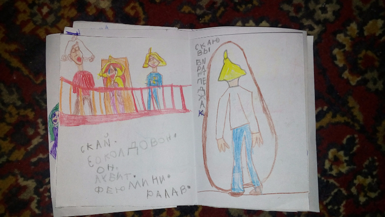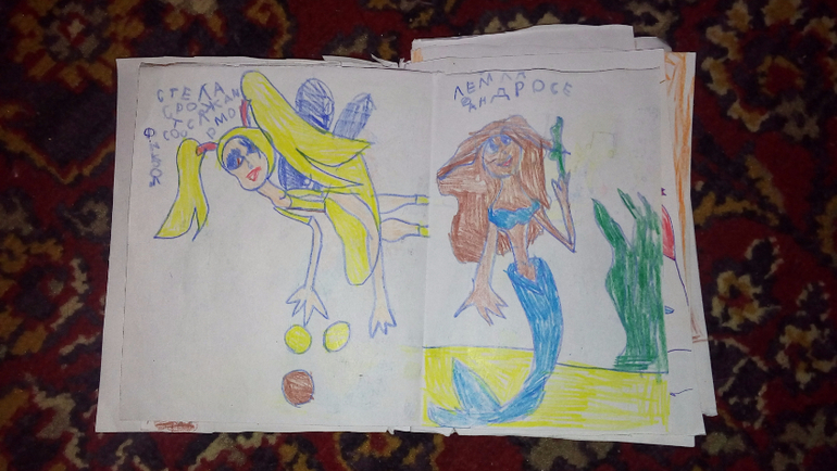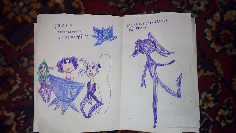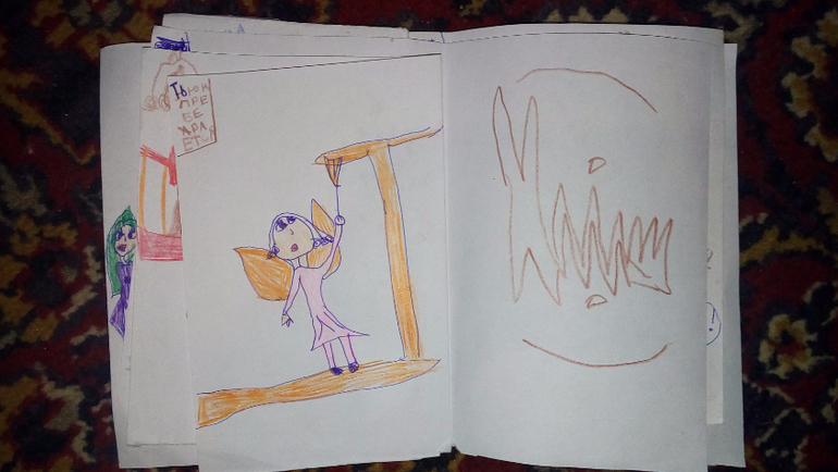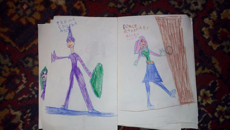 На мой взгляд для такого возраста очень хорошие успехи. Рисунки уже вполне взрослые, соблюдены основные пропорции фигур и хорошая композиция. Ну, а больше меня поразил сам текст, для самостоятельного письма это очень круто. Но, увы, я таких персонажей совсем не знаю. П.С. Алису с Днем Рождения и развития талантов и способностей!