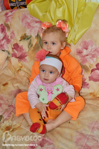 иногда Алиса на одной руке, а Диана на другой, да ещё и ноги подгибает, чтоб я её кружила. Любит так и на улице делать, засранка. Приходится с Алисой на руках её качать в качели, кружить, держать на турниках и т.д. Когда включаю утром Лунтика, они тоже вместе сидят на диване смотрят (Алиса или на боку смотрит, или в шезлонге. Лунтика обожает! Визжит при его появлении). Ещё Диана с Алисой играет в прятки: берёт её руку "Пойдём игать!", я держу Алису и помогаю ей как бы идти за Дианой в детскую. Там Диана её либо в домик зовёт Алису, либо в прятки играть начинает. Прячется от неё, а Алиса идёт с моей помощью искать её:) Ещё им обеим нравится, когда они играют в догонялки: Диана убегает и смеётся, когда Алиса догоняет её "ест" в животик "Сейчас Алиса Диану съест!!!!" И игра начинается:) Алиса тоже смеётся, ей нравится летать за Дианой у меня на руках:) Так же хохочат обе когда Диана качается на качели, и Алиса холчет её съесть, когда качель с Дианой приближается. Хохочат обе на весь парк!:) Вот сидеть научится через 2 месяца можно будет уже им вместе качаться! Играем в доктора. Диана у нас доктор - Алиса пациент:) Таблетки ей, уколы, лекарства. Конечно, только когда я рядом играем вместе:) Когда Диана спит, я полностью с Лиси, и наоборот. Как-то так:) Ещё часто гуляю с ними порознь. Пока одна спит, с другой гуляю. Потом они меняются местами. А потом мы гуляем все вместе. Обычно так, когда хорошая погода, гуляем.