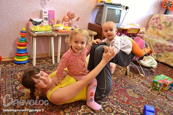 Здесь зарядку делает мама с малышом. Мне же приходится делать зарядку не с одним, а с двумя детьми))) Вот пример качания пресса: (муж увидел и сфоткал)