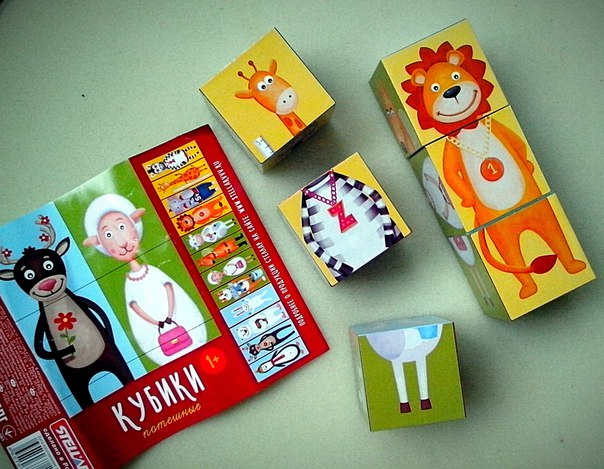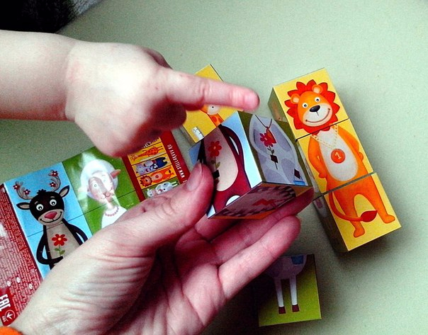С помощью кубиков учимся собирать цельный персонаж, разговариваем о них, а комбинируя разные кубики, получаются забавные животные, которым также можно придумать смешные названия.