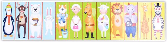 Можно собрать 12 зверюшек: пингвина, оленя, медведя, зайца, кота, овечку, собаку, корову, льва, слона, жирафа и зебру.