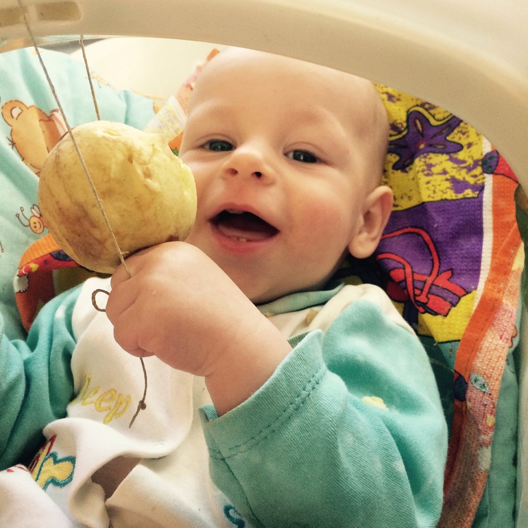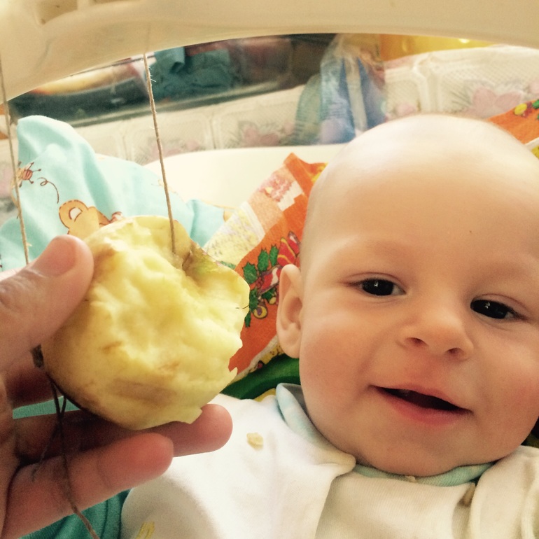 Придумал привязать сладенькое яблочко. Пока мама переоделась и кашу сделала сын наелся, мама в шоке отругала папу, но сына молодец ни разу не подавился