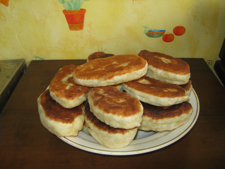 Из теста сформировать шарики диаметром 3-4 см. Каждый шарик раскатать, выложить начинку, тщательно залепить края. Жарить на подсолнечном масле на среднем огне по 2-3 минуты с каждой стороны.