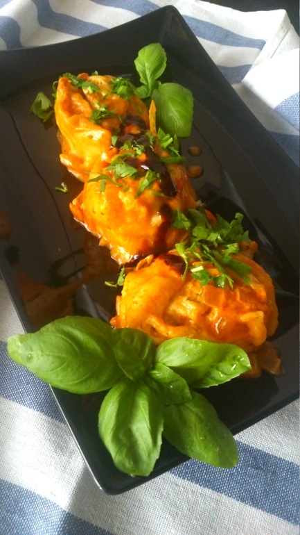Рулет разрезаем на кусочки 3 см. Ставим их "на попа" в глубокую сковороду (можно и в МВ), смазанную небольшим количеством масла. Заливаем на половину теплой водой и как покипит минут 5-7, залить зажаркой. Тушить на медленном огне ещё минут 25-30.