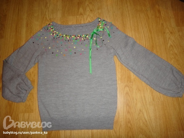 Свитер серый с разноцветными пайетками, рукав 3/4. Состав: шерсть+эластан. Очень красивый рукав и воротник . Размер S-M. Цена 1000 рублей.