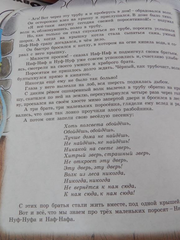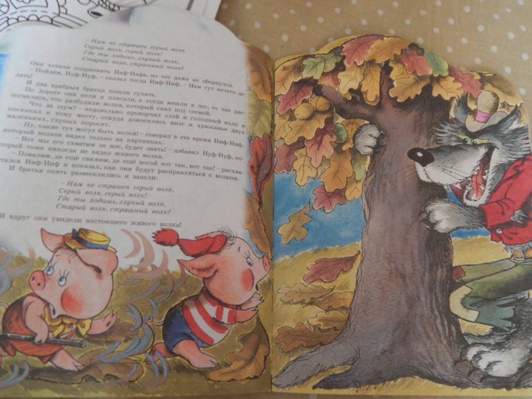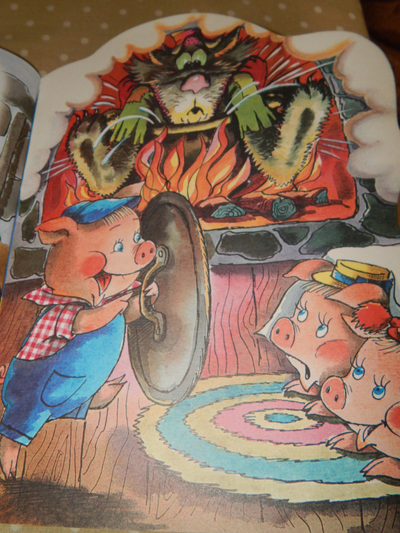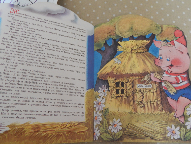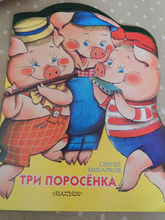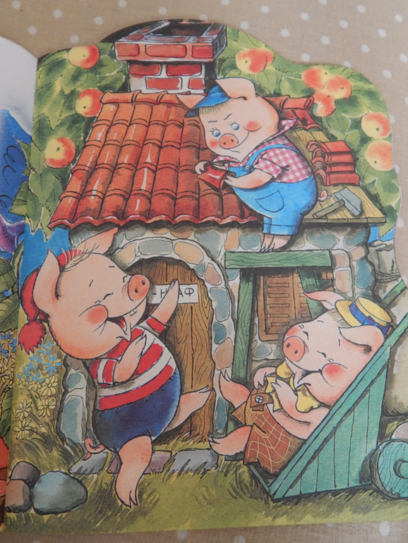 Тоненькая простецкая книжка про трех поросят, выбирала по отзывам - но что-то уж много текста, буду рассказывать кратенько по памяти, картинки хорошие.