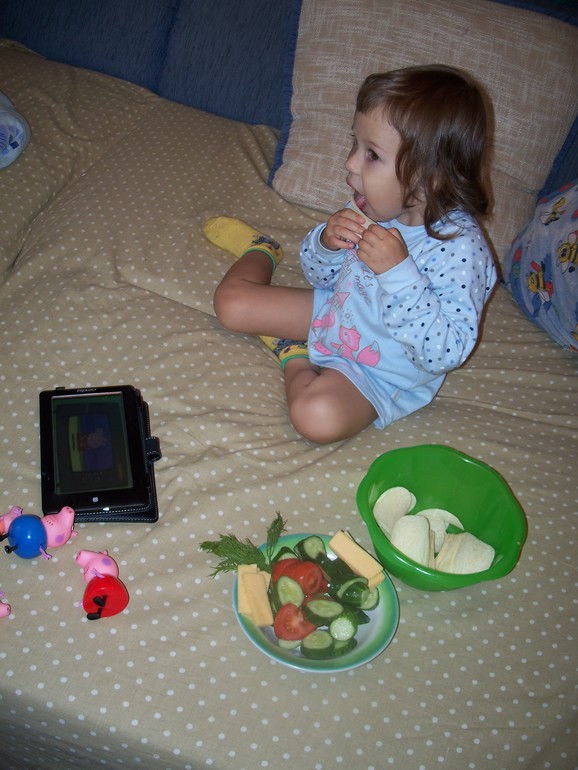 Появились негативные стороны сада - один раз укусили, стала капризной, требовательной, не хочет играть одна, много плачет и истерит, если не даю желаемое. Может ударить и сказать, что я - кака, а Аля маленькая и хорошая. Стала тащить мелкие игрушки в рот - вот откуда, если не оттуда. Просто балуется, делает вид, что хочет проглотить, я уже разборные киндеры убрала от нее.