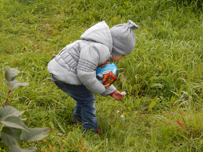 Поутру сходили на выборы и потом бегали на пришкольном участке с мячом, погода замечательная, свежая, осенняя. Интересно все - листочки желтые, цветочки, голуби. А свой мяч - вообще самый любимый, из рук выпускала только чтобы пнуть ногой)