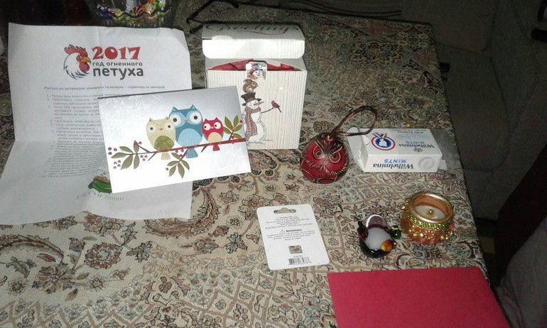 Игрушка на елку была сова .И как фея догадалась ,что сова моя любимая птица.И открытка была с совушками. Еще там был волшебный ,денежный талисман, красивая светящаяся брошка и очень вкусные орехи .Спасибо огромное .Получила очень много положительных эмоций .