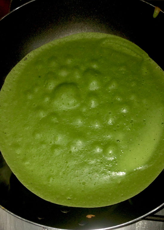 В шпинат добавить немного воды и взбить в пюре погружённым блендером. Добавить к тесту.хорошо перемешать до однородности.