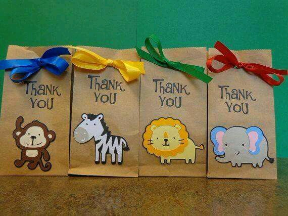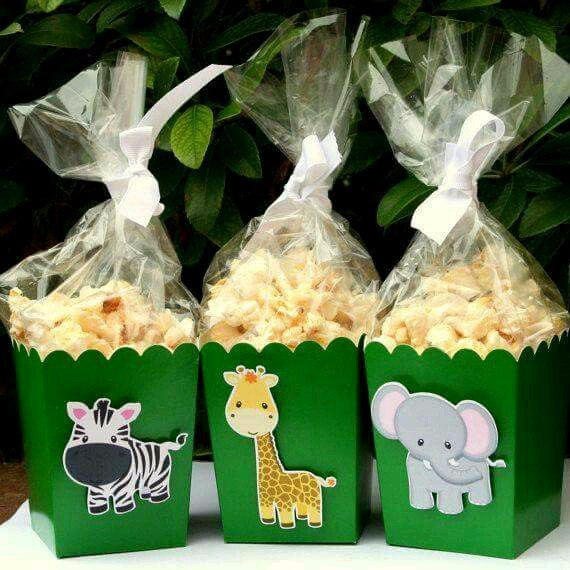 Коробочки для попкорна или сладостей можно сделать из цветного картона, пакетики для подарков - из крафтбумаги. Единственное, что придётся распечатать - это изображения разных животных.
