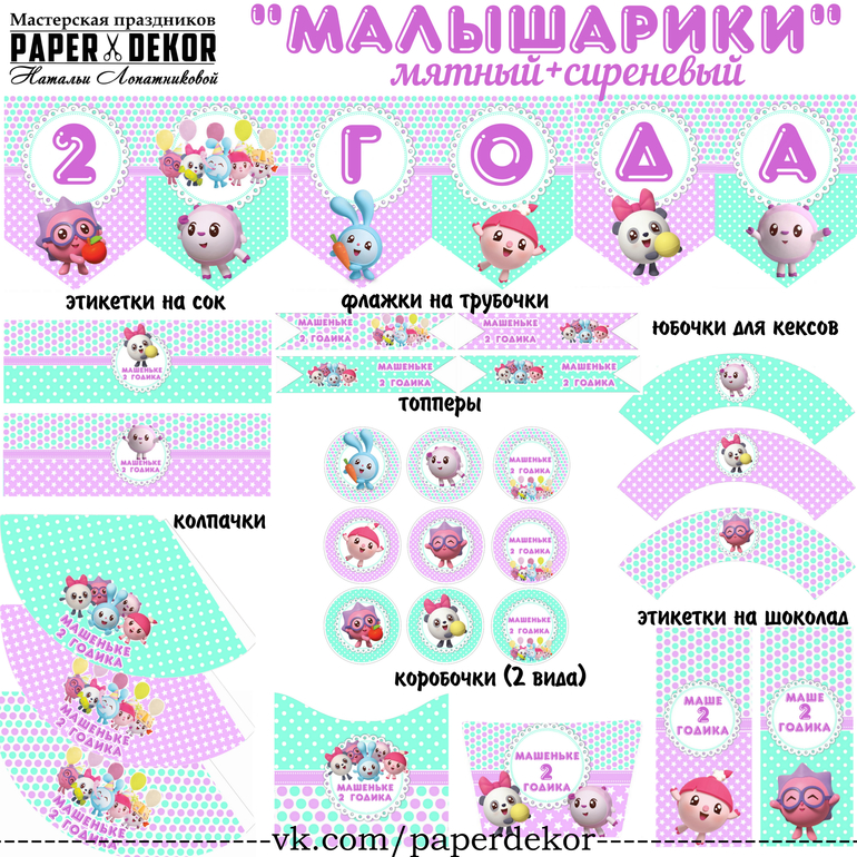Представляю вашему вниманию набор для оформления дня рождения в стиле Малышарики в сиренево-мятном цвете (возможно изменение цветовой гаммы). Стоимость каждого набора рассчитывается индивидуально. Минимального заказа нет, возможно изготовление любого количества выбранных Вами аксессуаров. Отправляю почтой по всей России