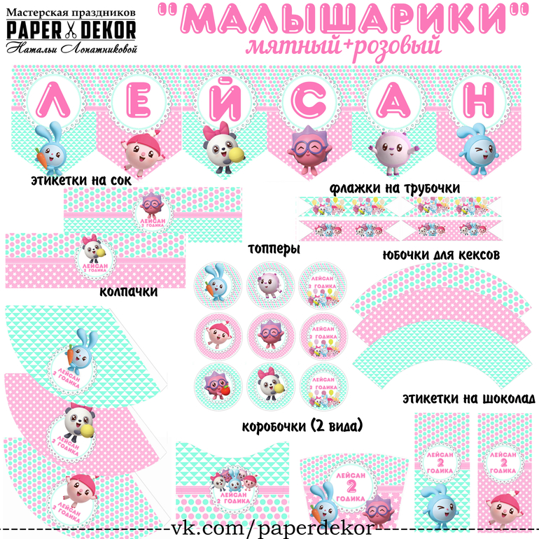 Представляю вашему вниманию набор для оформления дня рождения в стиле Малышарики в розово-мятном цвете (возможно изменение цветовой гаммы).