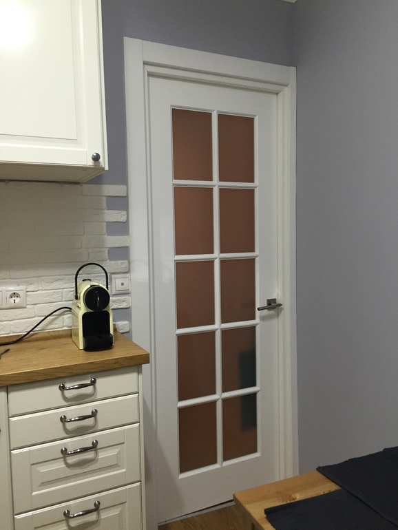 Ну и вид от окна. Дверь для такой маленькой кухни идеальна, добавляет пространства. Стекла матовые.