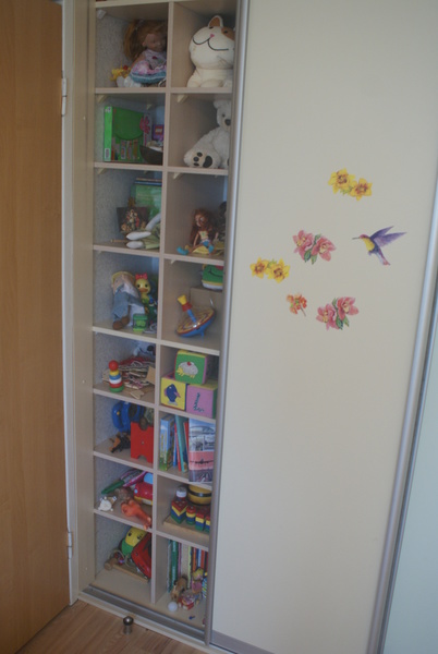 За ради достижения поставленных целей в комнате поклеены обои в полосочку (общую строгость пространства постаралась смягчить текстилем, шторки округлых форм (кстати, пошиты они из вульгарной марлёвки), мягкий рисунок на диванчике), встроенные шкафы использовала для книг и игрушек (ведь когда они закрыты, наступает номинальный порядок) и сделала там же много ящичков (они завсегда удобнее полок), мебель в светлых тонах. Катин диванчик (тот, что на фотографии верхней) на самом деле является кроватью 200х90 см, спинка и боковые валики очень лёгкие, снимаются ребенком без труда. Нюше пока диван достался от предыдущей детской, про её спальное место думаю. У Кати парта-трансформер, у Нюши - столик обычный. У окошка стоит ширмочка, на случай, если... Дверь в детскую не меняла сознательно, это пространство можно обклеивать бумажками, наклейками, рисовать, если уж так охота. Ну, должна же быть вольница хоть где-то :)
