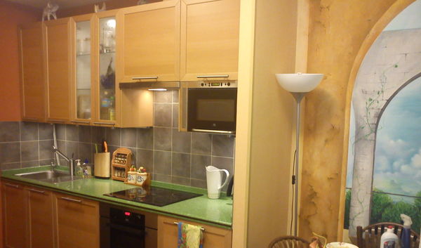 Полгода плохой погоды портит настроение отчаянно, по сему на кухне ярко-зелёная столешница и море на стене...
