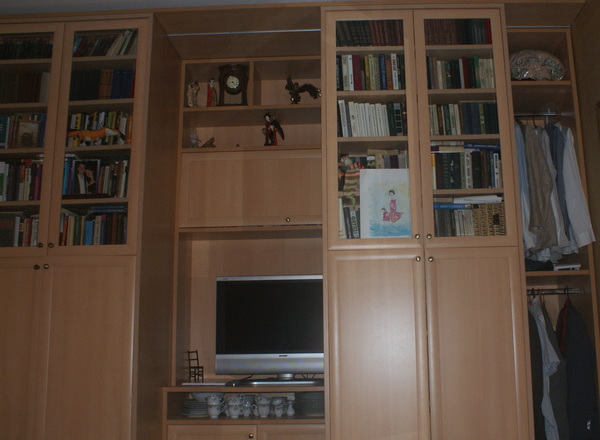 В спальне же проблему с пространством, шкафами, одёжей... решила посредством гардероба, дверками которому служат книжные шкафы.
